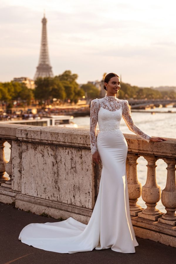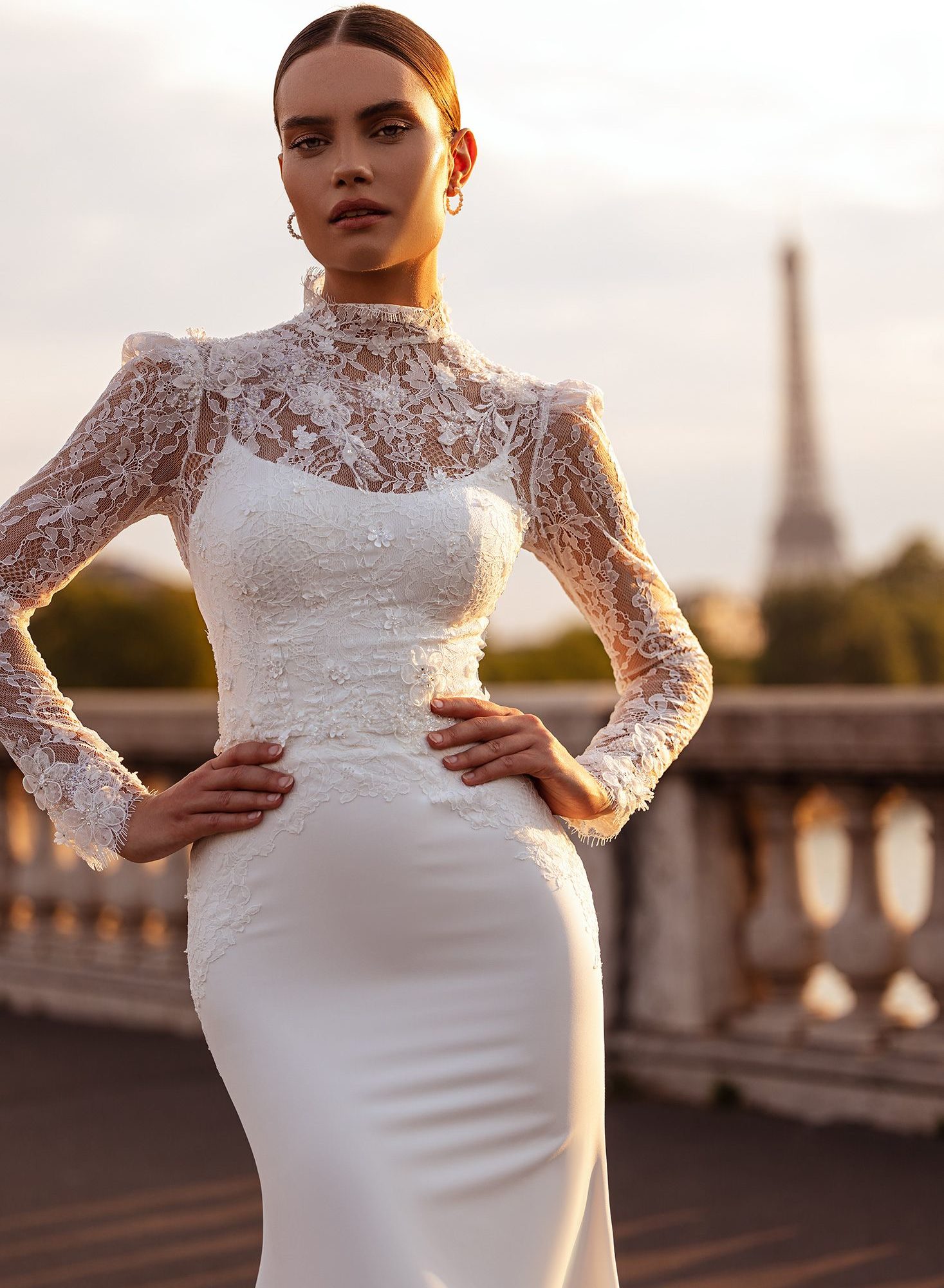 Este vestido de novia entallado, confeccionado en chifón crepé de corte impecable, irradia una elegancia atemporal. La parte superior presenta delicados tirantes finos y un elegante escote redondo adornado con una sutil capa de encaje Chantilly. La espalda abierta crea un look seductor y encantador. Lo más destacado de este cautivador vestido es el bolero de manga larga de encaje Chantilly, con un escote halter alto que le da un toque majestuoso al conjunto. Una mezcla de flores tridimensionales, distribuidas por todo el bolero, realza el estilo, dotándolo de un brillo lujoso y radiante. La cola capilla completa el look.